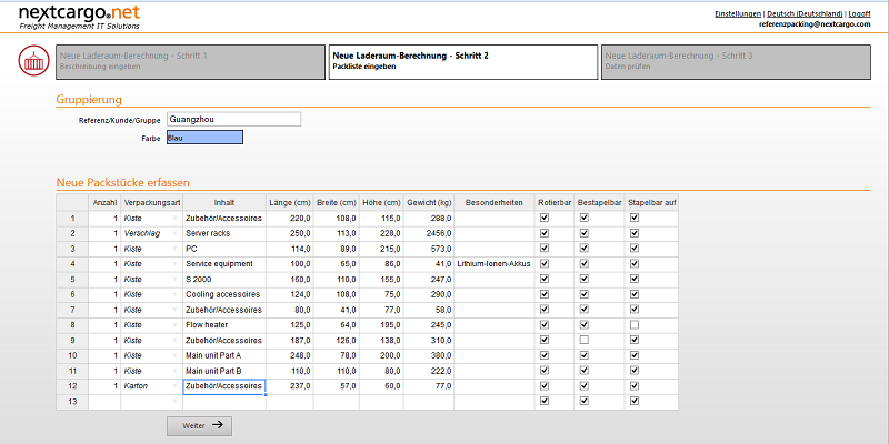Ihre Packdaten geben Sie in blitzschnell in die komfortable Schnelleingabemaske ein. Oder übernehmen Sie diese automatisch über die Schnittstelle zur Berechnung in PackApp. Natürlich können Sie zu jeder Zeit einzelne Packstücke der elektronischen Packliste hinzufügen oder aus dieser entfernen. Für die Berechnung stehen verschiedene Optionen zur Verfügung. Sie können so zum Beispiel die verwendeten Container-Typen und deren Anzahl angeben. Mit Hilfe von unterschiedlichen Beladungs-Modi (LCL und FCL) erzielen Sie das optimale Ergebnis für Ihr Ziel.